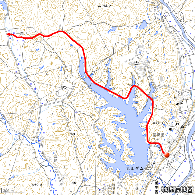 現在の経路を地理院地図に重ね描きした画像を示す。●は起点、矢印は終点を表している。