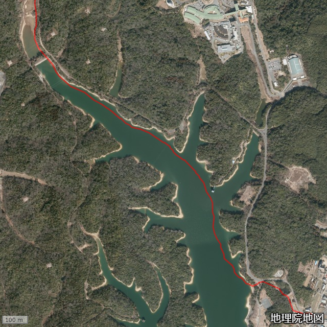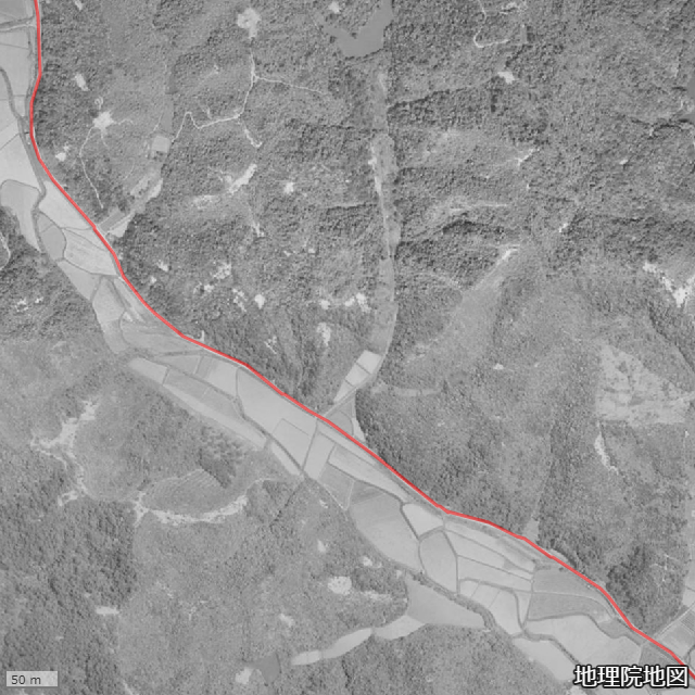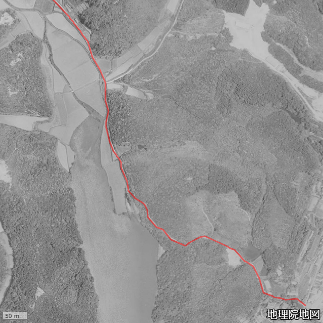 シームレスに閲覧できる国土地理院の近年の航空映像と、昭和39年のモノクロ空撮映像により、ダム以前の経路の解析ができている。以下のキャプチャ画像は、ダム建設以前の経路の2分割映像。