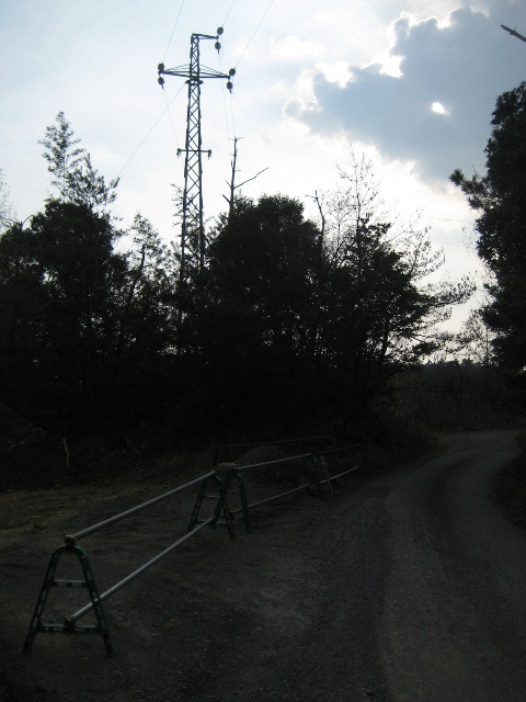 直線路の正面に奇妙な形の鉄塔がある。