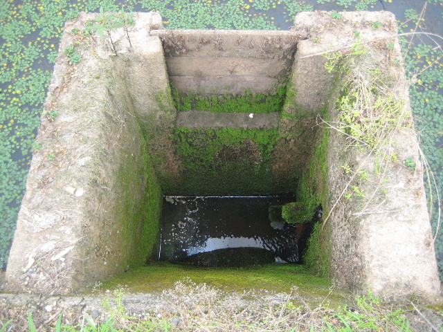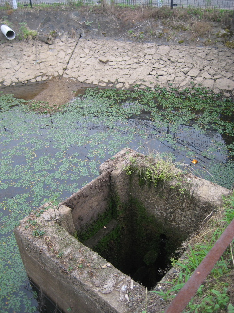 余水吐の桝に堰板があることから、かつては周辺の灌漑用水を貯留するために使われていたのだろう。しかし現在は用水の需要期にありながら、堰板の下までも水位が到達していない。更にこの淀んだ水質から推測されるように、今は使われていないようだった。