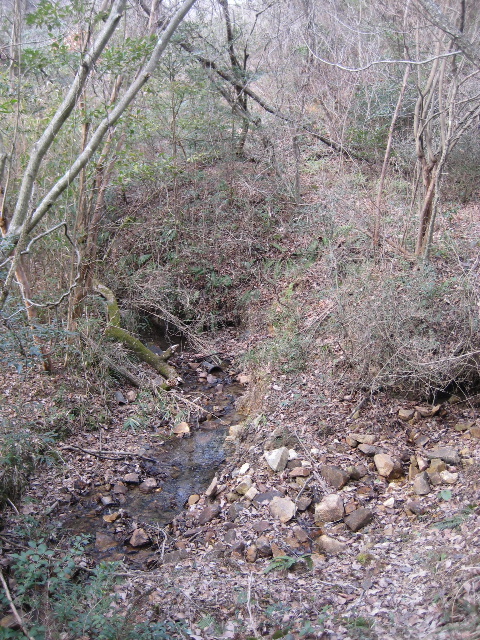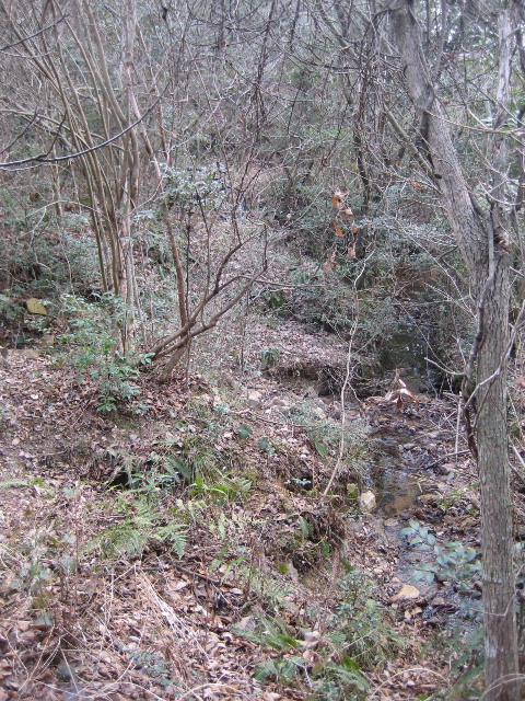沢に沿って進んでいた記憶があるので、恐らく途中から市道を外れてしまったものと思われる。最後に道を失ったのは小川を渡った先だったから、山道が小川の反対側へ移る×印あたりの何処かだったのだろう。