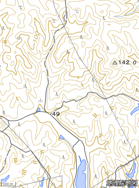 残土捨て場と思しき場所の北西側に沢の分岐点があり、そこで沼田ヶ原に向かう山道と立熊に出る市道の線形がハッキリ見てとれる。山道と田畑、そして山野部が明瞭であり荒れ果てた藪は見られない。