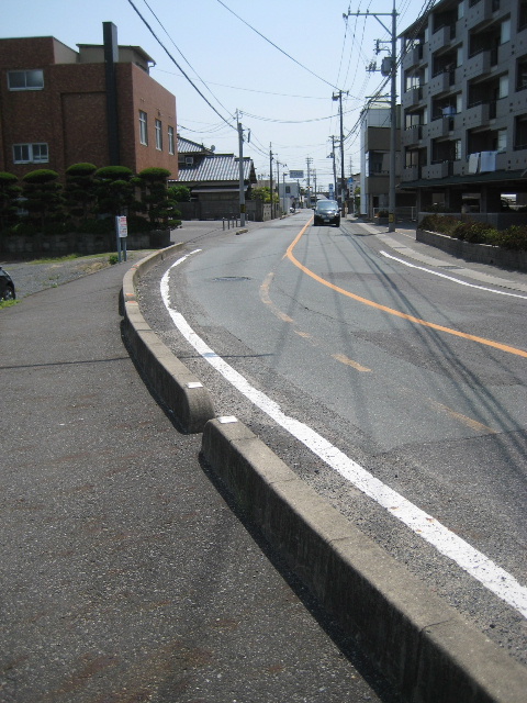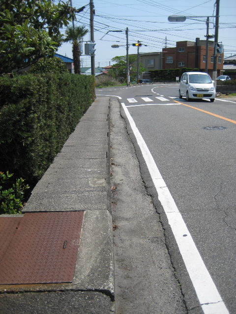 前方の信号が青なら何もそんな曲芸じみたことはせずそのまま車道を経て交差点を走り抜けるだろう。しかし先が赤で信号待ちが予想されるとき車道で停まると後続車の邪魔になる。だから信号が赤ならここでコンクリート蓋の方へ上がっていた。そして信号を待とうとして停止すると…停まった位置によってはコンクリート蓋から外れて地面に足が届かないのである。私たちが学生だった時代はそれほど自転車で車道を走るのは良くないことと教え込まれていた。[2]