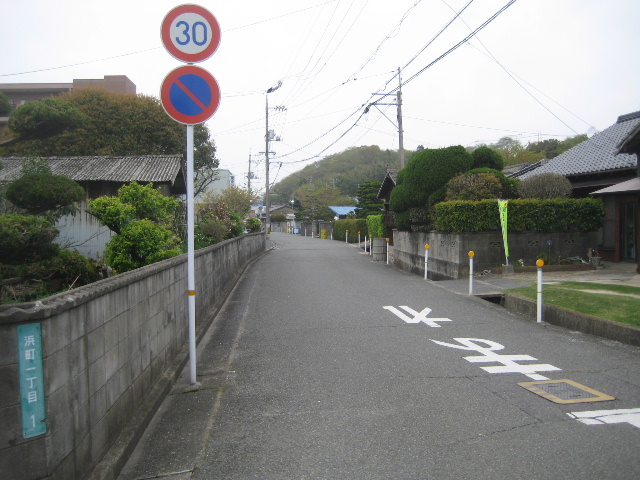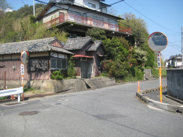 あらかじめ仕入れた情報によれば、市道浜中山線はこの写真で左側にあるミラーのところにある細い路地を山の方へ進むようになっている。