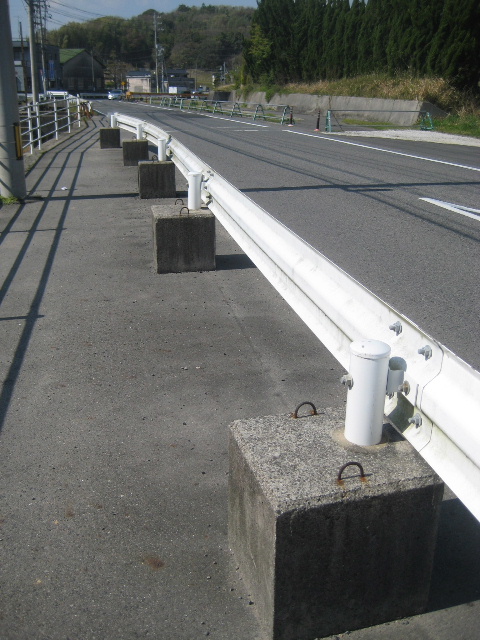 支柱が埋め込まれたタイプではなく、サイコロ状のコンクリートの重しがくっついた可動式のものになっている。道路線形が最終決定されていない場所によく見られるタイプだ。