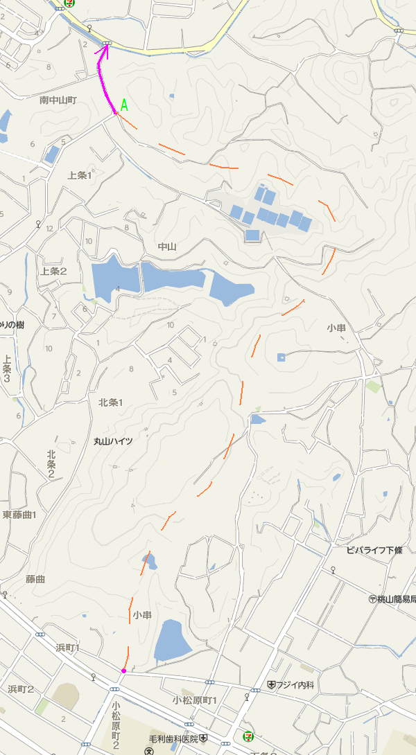 市道路河川管理課の保有する地図では、起点の浜町一丁目から幅広の道が始まるA地点までの区間は破線で描かれていた。ルートは恐らく適当だろうが、蟻ヶ迫池の北側にある名前のない小さな溜め池を横切り、標高74.4m地点にある電波塔の西側を通過し、浄水場およびその進入路を避けて山裾を通る経路になっていた。