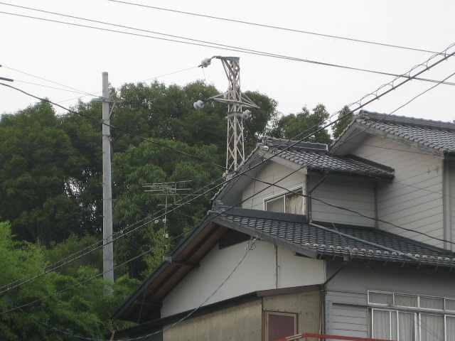 正面に見える大きな民家の裏手に興味深い送電鉄塔が見えている。