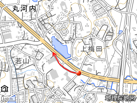 道路改良以前は本路線のカーブのすぐ外まで丸河内池があって、上梅田丸河内線は堰堤の上を通る道だったようだ。新たに4車線の国道が出来たので、現在は本路線を介して沿線の店舗などへ出入りする通路のように機能している。出入りがスムーズに行えるように幅を拡げ、接続位置も変更している。