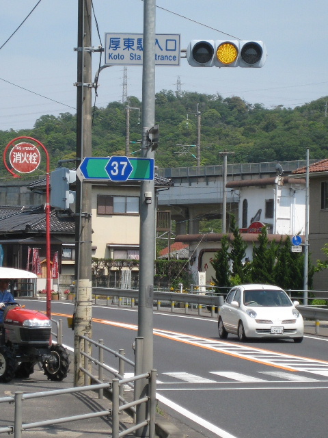 信号に「厚東駅入口(Koto Station Entrance)」の案内板が見えます。