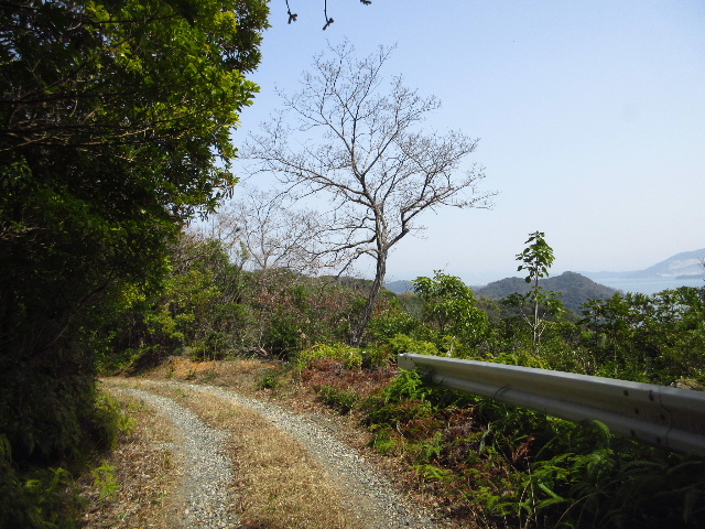 眺めが一向に開けない中でこのガードレールがあるカーブを左に曲がると、初めて海が見える場所に出会った。