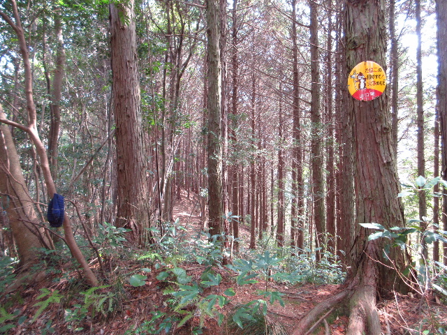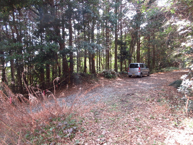 主要な林道では、起点に路線名を記した標識が立っていることがある。そのようなものは現地には見られなかった。この幟があるから林道とは断定できない。一般に林道は関連業種以外の人が車を乗り入れる道ではないから、ロープが張られていたり門扉で施錠されていたりする。そうしたものがあれば現在地が大浜地区へ降りる場所と断定できる。