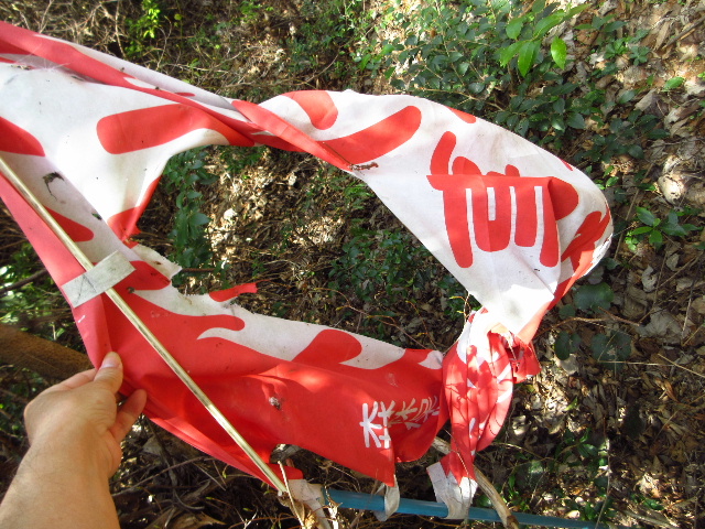 全部の文字は読み取れなかったが、森林保全のような白抜き文字が見えた。この先は林道ですと告知するために設置された幟と考えたのだ。
