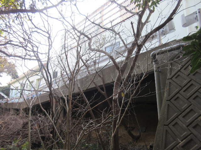 建物の敷地面積を確保するには丘を削って均した平場だけでは足りなかったらしく、斜面にかかった部分はスラブ構造にしている。