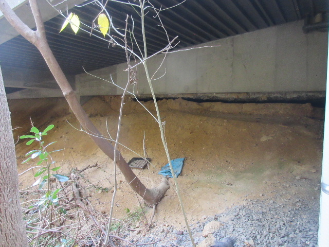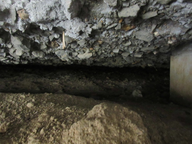 即ち建物のこの部分は主要な部分で柱に支えられているものの、地面とは接していない。おこし状に見えている石材からすると基礎部分を捨てコンクリート施工した後で土砂部分が流れ出たのかも知れない。床の基礎が宙に浮いている状態で、自然にこうなったのだろうか。