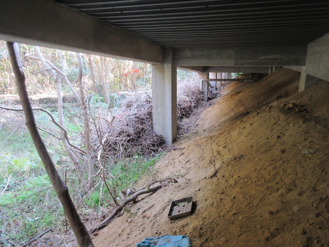 斜面は粒子の細かい粘性土状だった。真砂系の土砂が最終的に行き着く土質で、市内ではありふれた部類である。蛇瀬橋の橋脚下にもこれと同様のものが見られる。
