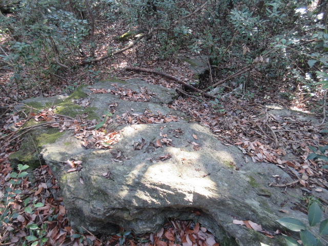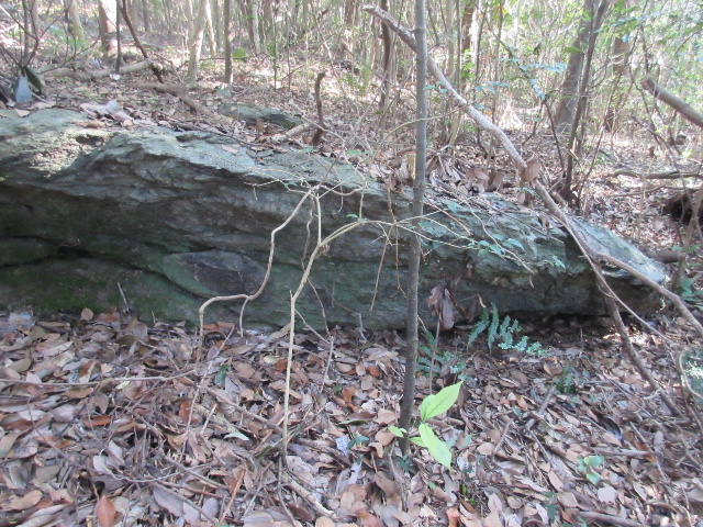 藪の中に埋もれる岩の海となれば、個人的には白岩公園のものを思い浮かべる。両者の岩はまるっきり異なっている。白岩公園の岩は灰色から薄茶色系の色が殆どで、角が取れて丸っこい大岩が目立つ。他方、ここの岩は緑から黒など濃い色が殆どで、形状も角が尖ったものが多い。地学の知識がなくとも両者の岩がまったく異なることは素人目にも分かる。