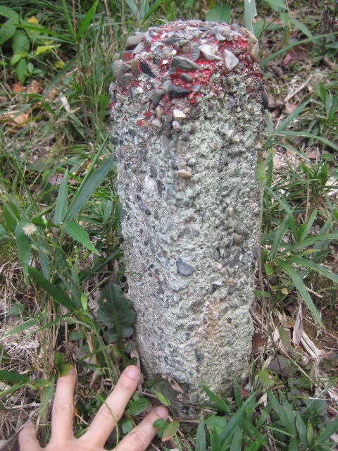 引き返しに階段を登っているとき、異常に古めかしいコンクリート杭を見つけた。