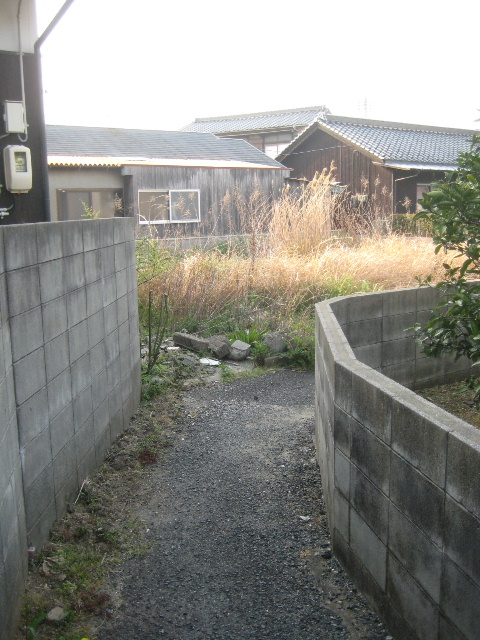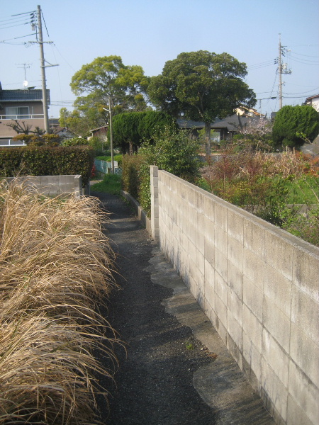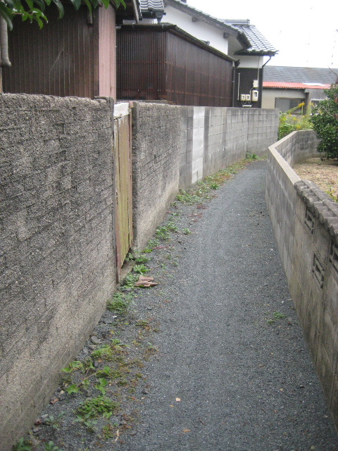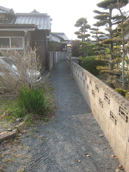 民家の塀に沿って未舗装路が伸びている。