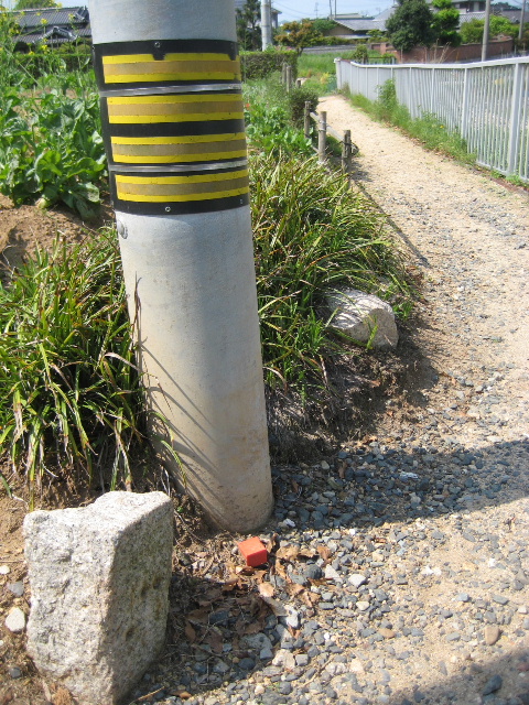 この分岐点の頂点部分に境界柱らしきコンクリート柱が埋め込まれている。市道宇部新川恩田線の方へ出るこの道を挟んで加工されたと思われる石柱が埋められている。