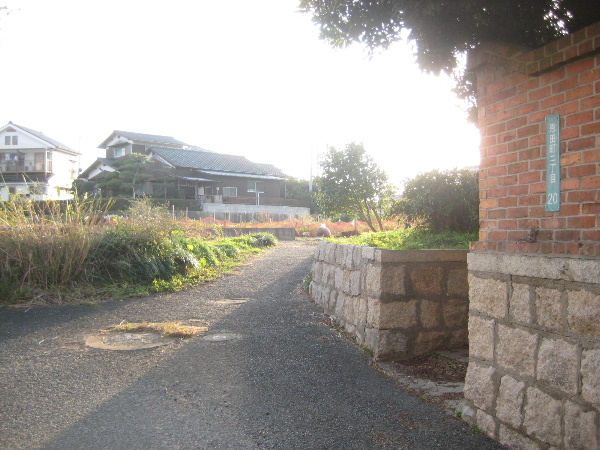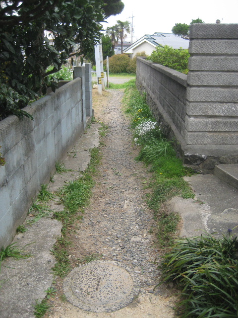 生活道の端に沿って僅かながら赤レンガが遺っているのが見える。 このレンガの高さが不揃いなのが塀ではなく元から生活道と敷地を仕切るために並べたものと考える理由だ。