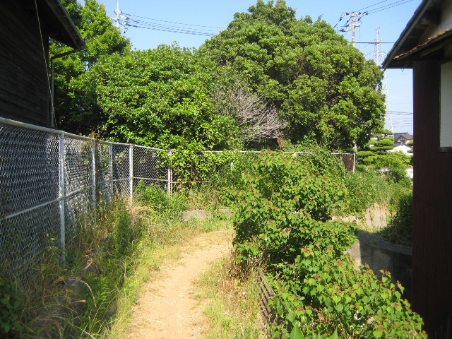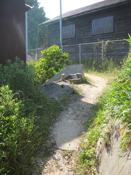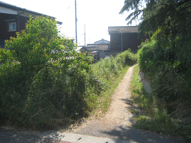 あぜ道同然の踏み跡なので、詳細な経路もよく拾い上げているYahoo!地図ですら経路として表記されていない。実際には上の地図でグラウンドとして表示されている色違い部分を伝うように踏み跡が伸びている。即ち色の濃い領域は小学校の敷地である。