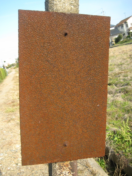 コンクリート柱に鉄板を取り付けていて全体が酷く赤錆になっていて何が書いてあったのかまったく読み取れない。