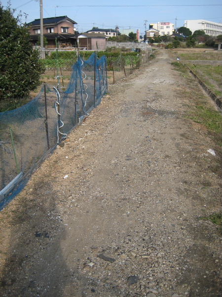 畑が拡がり始める辺りから農道部分の地面に細かな石やタイルの散乱がみられる。