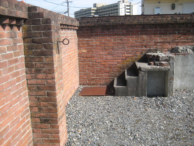 敷地の内側にある赤茶色のレンガ塀と謎の階段である。