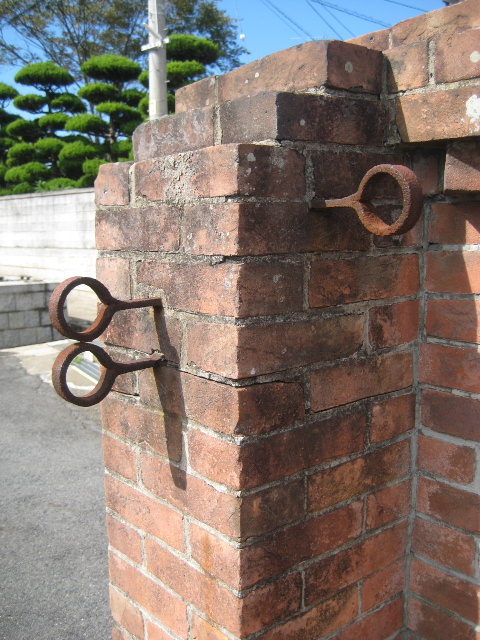 レンガ塀の控え柱部分に埋め込まれた鉄の部材。