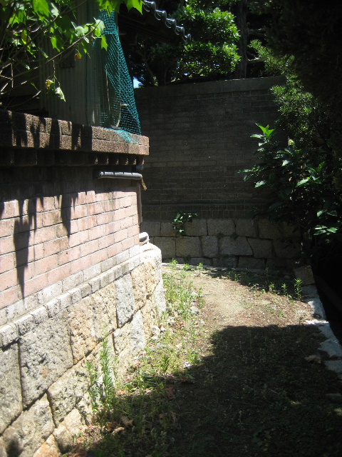 高い側の敷地は下を通る生活道から6m以上の高低差をもつ。レンガ塀の天端からみれば10m近い。