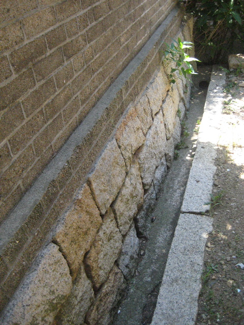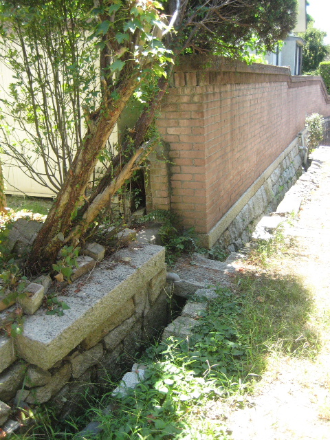 道の片側に溝を造って雨水処理している。縁も底もすべて土を露出させず石材とコンクリートで処理していた。