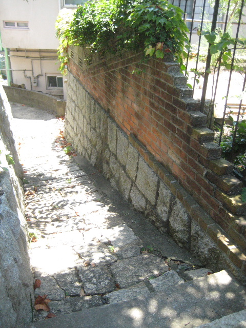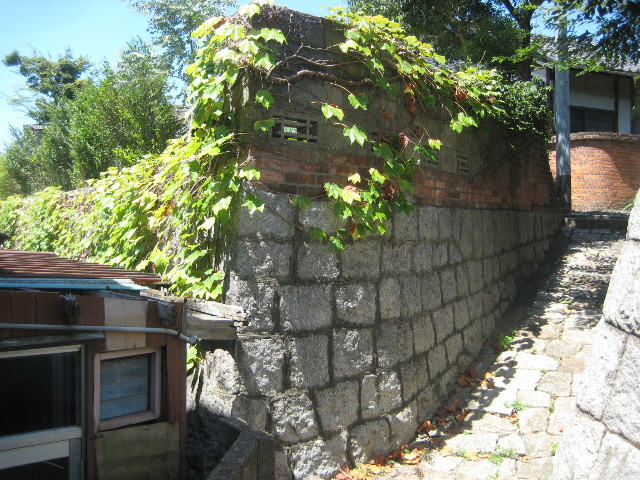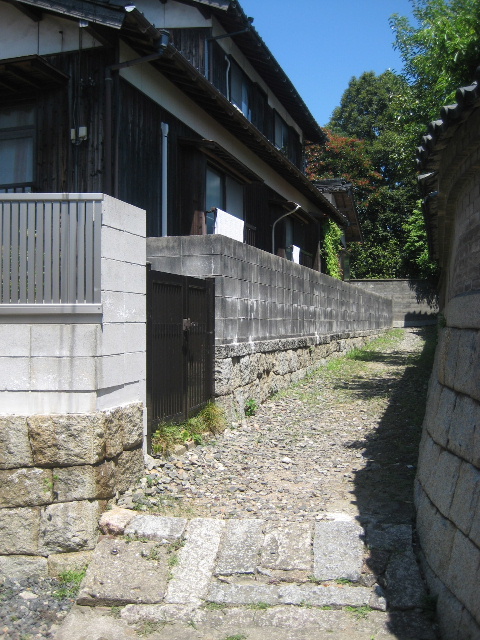 軽く曲がった先は両側が石積みの敷地で、アスファルトの生活道は石畳の坂に変わった。