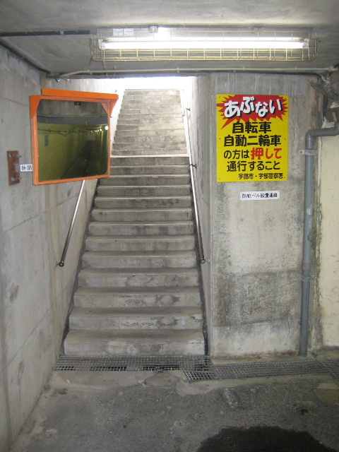 市道路河川管理課で認定市道の名称と経路を調べているうちに線路の下をくぐる地下道を経由している路線であることで早くから知っていた地下道であった。ただし宇部駅での乗り降りをしたことが一度もないため、実際に地下道を通ったのは認定市道の走破レポートを連発していた2010年の9月である。里の尾方面へのネタ採取で自転車を漕いだ回数はまだ数少なく、その場合も県道の寺田橋経由か殆どなため、この地下道を通ったのはまだ2〜3回程度である。