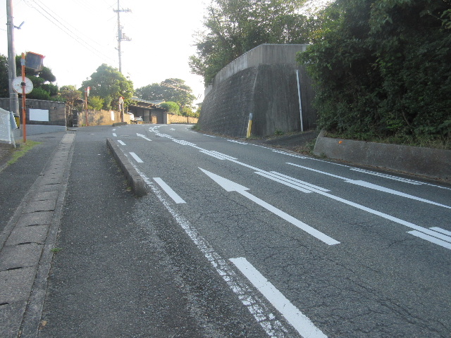 写真からは分かりづらいが上の写真のカーブミラーがあるところで水路同然の江頭川を横切っている。即ち本路線は近傍のもっとも低い位置を流れる江頭川を横切って登り坂になり、そこから一気に岡ノ辻へ登る。このことが坂の高低差を大きく感じさせる要因となっている。