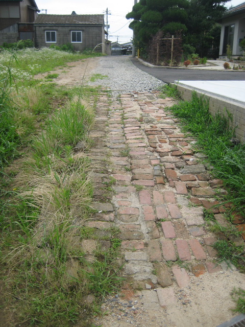 この場所だけレンガが敷かれている理由は幼少期から推測できていた。丘陵部へ向かって登り坂がきつくなっている上に地山は粘性土で、雨が降ると酷くぬかるんで滑りやすかった。坂を歩きやすくするために角地にあったレンガ積みの建屋を解くとき供出されたのではないかと思われる。
