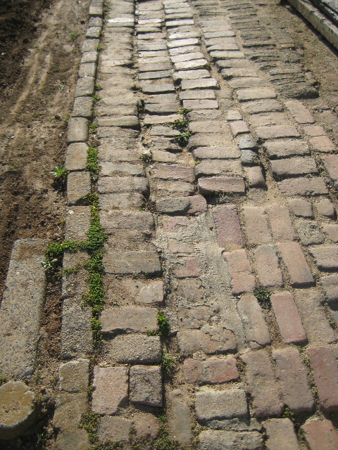 使われているのは新しいレンガではない。色や形はバラバラだし、半分に欠けているものすらある。敷き詰め方もインターロッキングのような上品なものではなく、大きさの合うものを適当に埋め込んだだけである。レンガとレンガの間隙が広がってしまった部分には、後付けでモルタルを詰め込んだ部分もある。当初から新品のレンガを敷き詰めて作った道なら、こんな雑な作業はしないだろう。