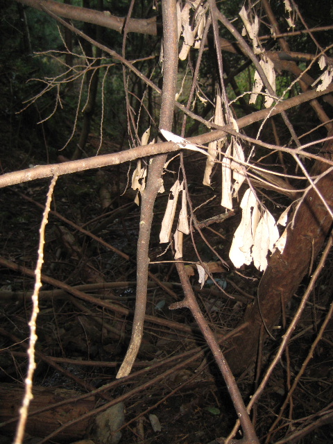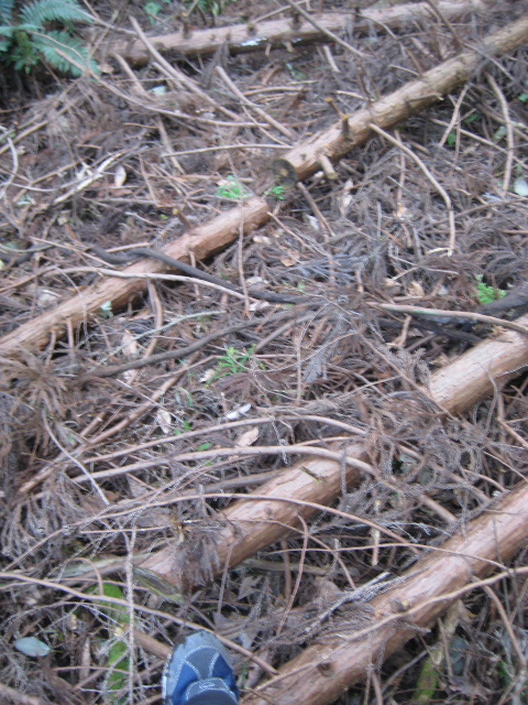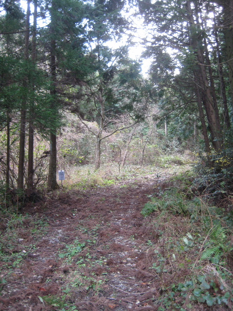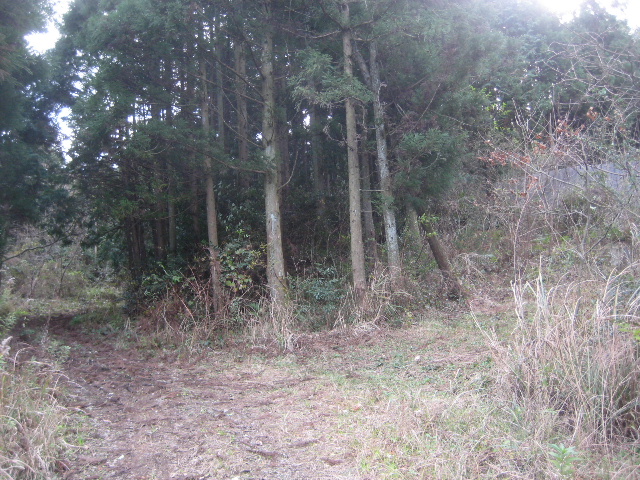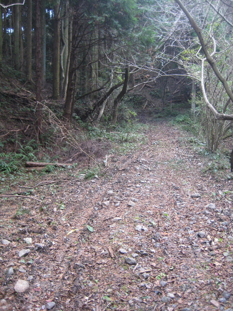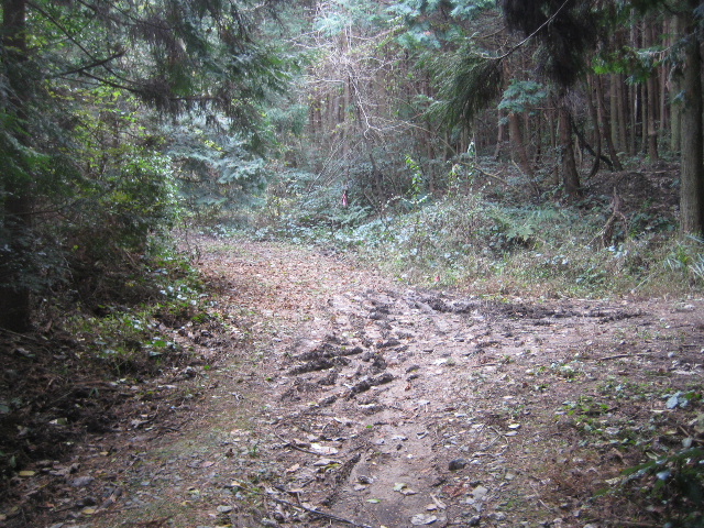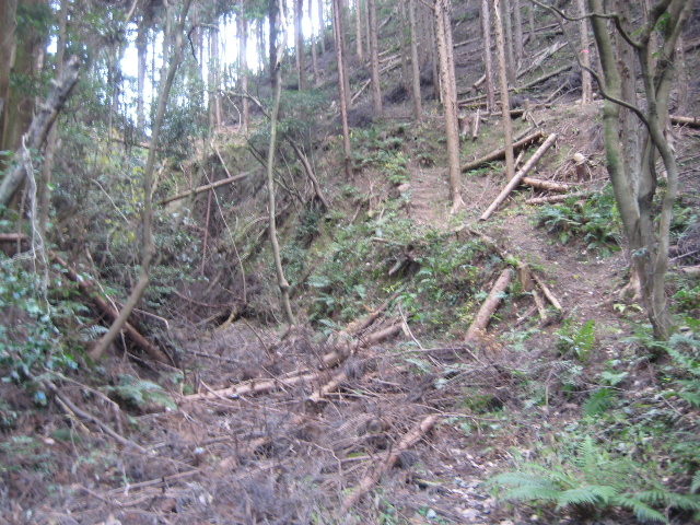 山の斜面を溝状に削り取ったような道形が軽くカーブしつつ伸びている。それにしても一体いつ伐採したのだろうか…周囲は適当な長さに伐られた枝や幹が無秩序に散乱していた。