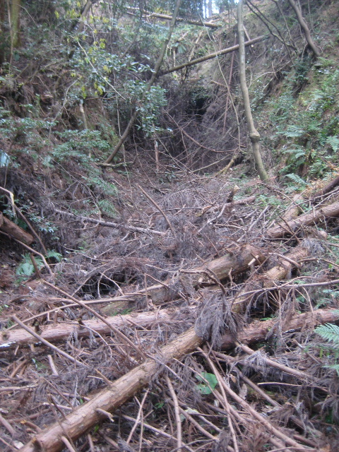 坑口の手前に枝を沢山伴った大きな伐採樹が垂れかかっている。枝か邪魔で接近に骨が折れた。