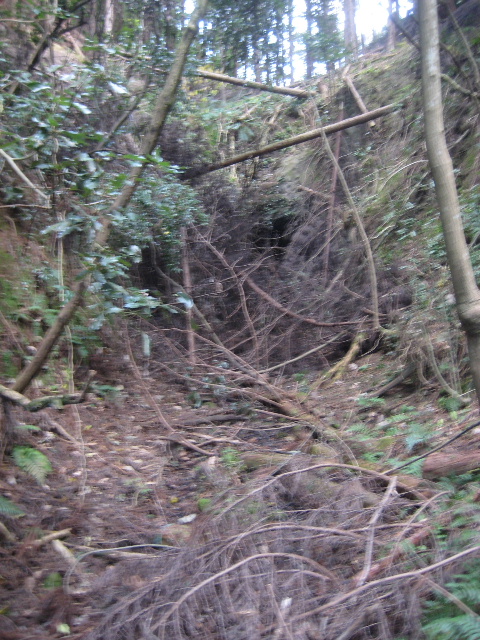 周囲の山裾は高くなりながら、溝状に高さを変えず進む線形がある。どう観てもこれは隧道に向かう典型的な地形だ。しかしこの溝状領域まで木の枝や幹がなだれ込んでいて、歩きづらいことこの上ない。坑口らしき黒いものが見えるがまだ断定はできない。