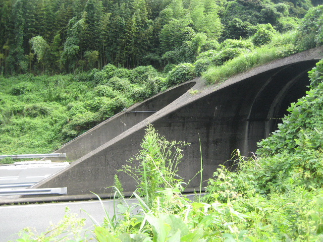 相応の事情があって地被りが薄いのに堀割ではなくトンネルとなっている事例は、国道9号山口バイパスの朝田トンネルにも観られる。街中を走るバイパスに突然短いトンネルが現れるのでかなり目立つ。ここは道路計画線上に朝田墳墓群があるため、トンネルの形でバイパスを通して墳墓を保存しているのである。
