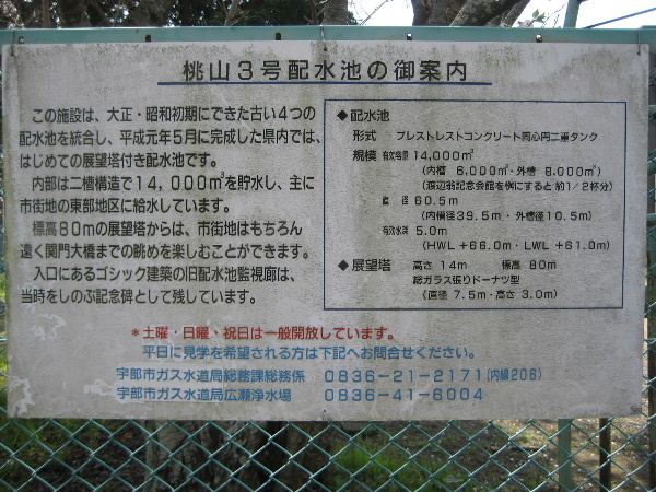 現在、このエリアにある配水池は展望台を備えた3号配水池のみで、市水道局の第8期拡張工事に桃山中継配水池として造られた。諸元は以下の通り。[1]