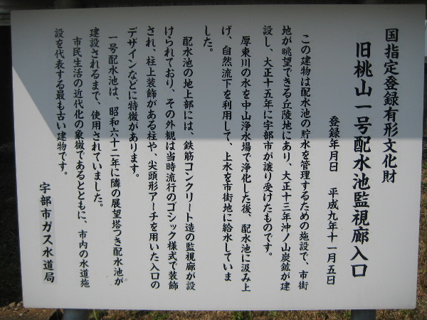 桃山配水池の最初の設備は、沖ノ山水道の大正期による旧1号配水池であった。一連の設備群が宇部市へ有償譲渡された後、第1期拡張工事で鉄筋コンクリート造りの2号配水池が造られている。その諸元は以下の通りであった。[1]