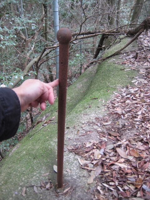 巨岩の縁には転落防止のロープを結わえ付けたと思われる鉄棒が打ち込まれていた。