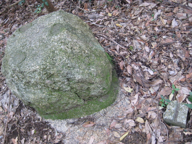 初回踏査で法篋印塔の前にあった石材のベンチを観たときは、遠足の子どもたちが坐ってお握りをほおばる姿が想像された。この巨岩の上もその平坦さを利用して来園者が新聞紙を敷き昼食をとる場になっていたのだろうか。
