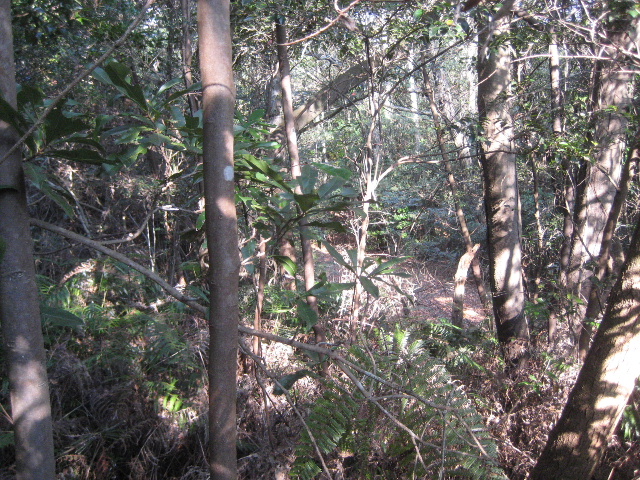 地図ではものの50m程度の筈なのである。心理的には200m位歩いているように思われた。シダ群生に見舞われれば1mの直進すら厳しいのでもし植生がすべて取り除かれた禿げ山状態なら白岩公園コースからも直接見透せる位に近いのかも知れない。