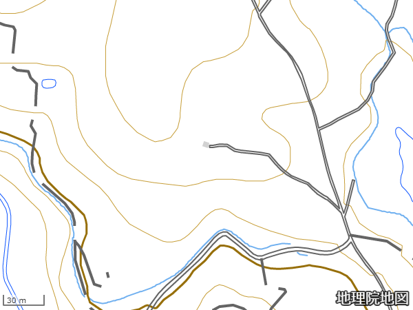 最近、地理院地図の拡大表示データを眺めていてこの部分の詳細な路線表示が得られることに気付いた。白岩公園コースの分岐点近くを表示させてみると…御堂らしき建物に向かう細い道が表示されているではないか。[1]