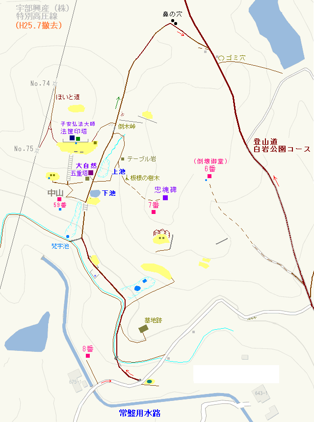 2. 当初作成した白岩公園周辺のマップでは左側の分岐そのものが白岩公園コースと考えて記述していた。実際は右側が白岩公園コースと判明したので改定マップではこの経路図を描き換えている。