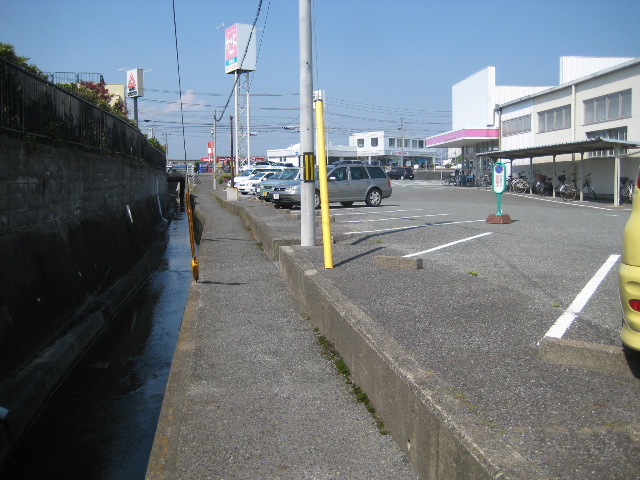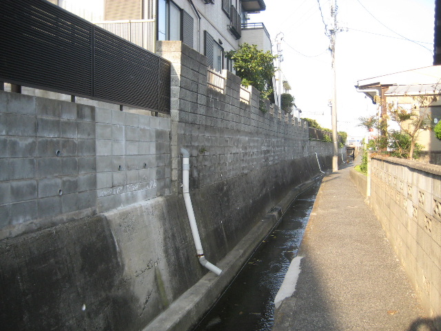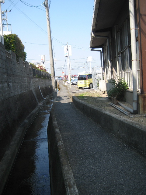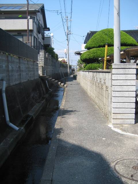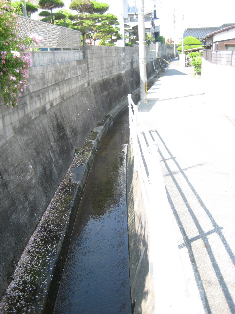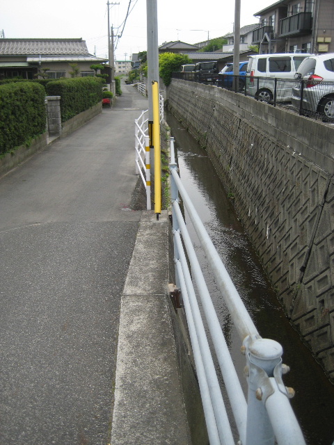 水路は蓋掛けされておらず柵も市道に接した一部分しかない。途中の民家までは車が入れる幅の道があり、その先は自転車まで限定で通れる狭い道になっている。