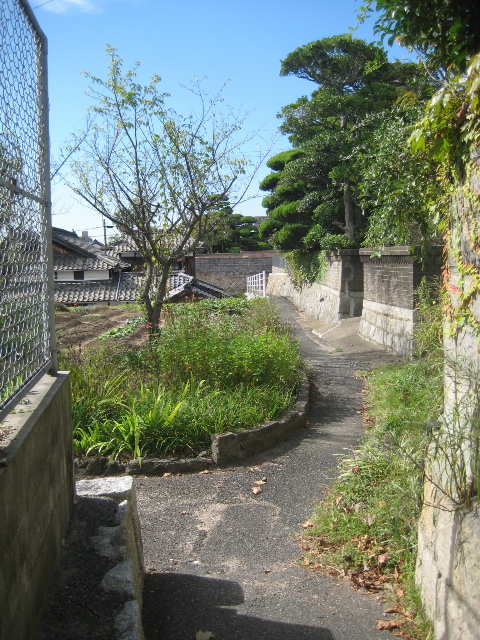 白いガードパイプの目立つ路地。市道が石畳道を過ぎて島の丘陵部へ向かうとき最初に出会う分岐路として、初めて訪れたときから気付いていた。