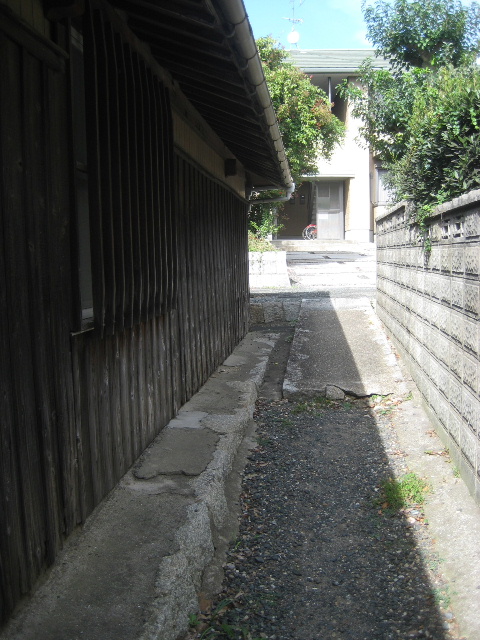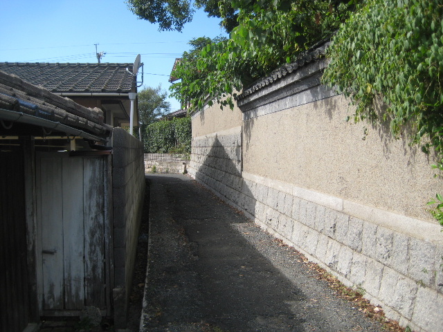 右手にデジカメを構えたまま自転車を押し歩きする。路地と敷地を隔てる部分は土塀のような様相で、瓦も乗っている本格的なタイプだ。